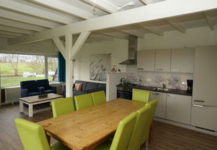 Das Wohnzimmer hat eine gemütliche Sitzecke mit drei Sofas und einem Sessel. In der Küche steht ein großer Esstisch, der Platz für bis zu 8 Personen bietet.