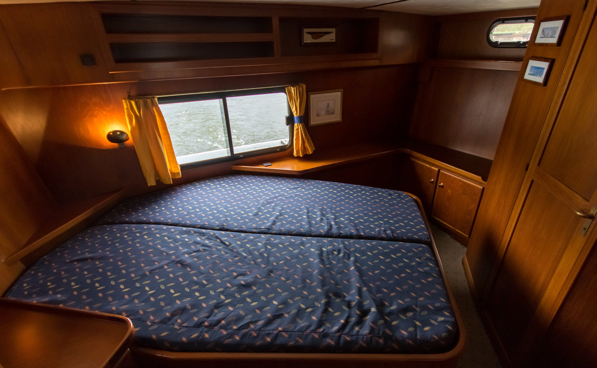 Die Noblesse 38 Motoryacht bietet Platz für maximal 4 Personen und ist luxuriös eingerichtet und sehr geräumig. Im Vorder- und Achterschiff befindet sich eine große Schlafkabine mit einem freistehenden Doppelbett und einem Badezimmer mit Toilette, Waschbecken und einer Dusche mit Schiebetür. Die Achterkabine verfügt über ein großes Schiebefenster, sodass Sie vom Bett aus einen herrlichen Blick auf das Wasser haben.